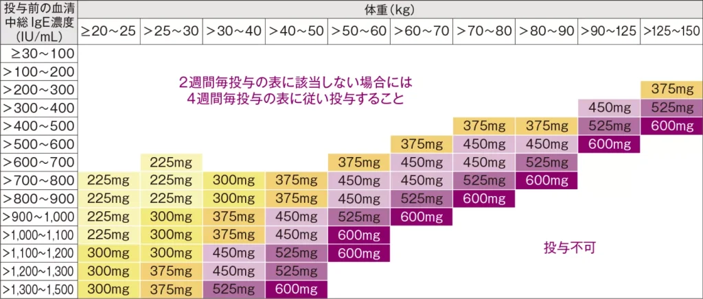 A. 保険適用となっており、初回投与前の血液検査で測定される総IgE濃度および体重に基づいて決定されるため、患者様ごとに異なります。