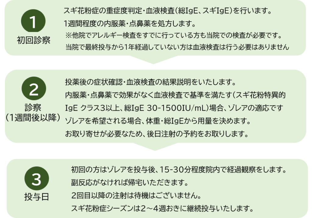 | ☑スギ花粉症の重症または最重症(鼻アレルギー診療ガイドラインに準ずる) ☑内服薬(抗ヒスタミン薬)+点鼻薬(ステロイド)を使用しても効果が乏しい ☑スギ花粉特異的IgE抗体がクラス3以上 ☑12歳以上で、血清中総IgE値が30~1500IU/mL、体重20~150kgの範囲 |