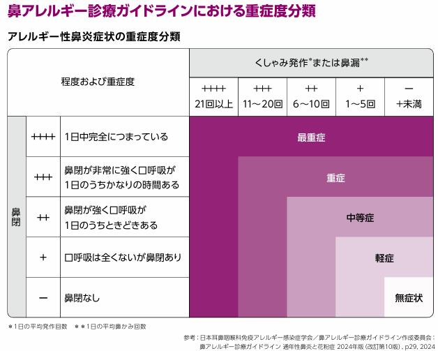 「季節性アレルギー性鼻炎(既存治療で効果不十分な重症又は最重症に限る)」に対して保険適用が承認されており、従来の薬では症状が抑えられない“重症~最重症”の方を対象とした治療です。