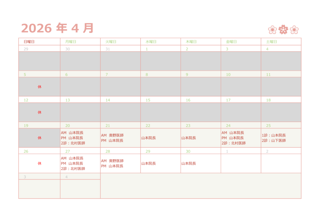 本日より、一部の日程で2診体制となる日や、院長が不在となる日がございます。